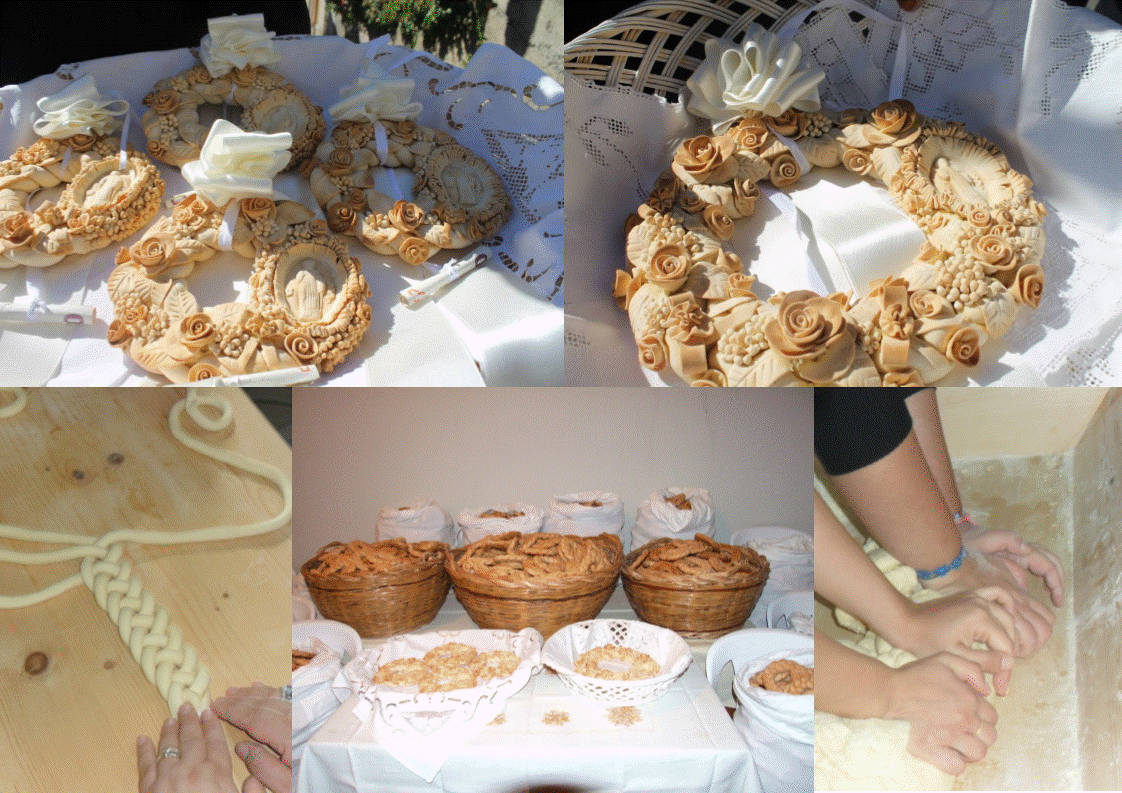 Le “Cuddure” sono fatte di: farina di frumento, lievito madre, acqua e sale che vengono impastati dalle donne della commissione nelle madie (maida) e lavorati fino ad ottenere un impasto morbido e liscio. La pasta ottenuta poi viene pesata intrecciata sulle spianatoie (scannaturi) e posta a lievitare su dei letti. Una volta lievitate vengono infornate nel forno a legna e poi poste nelle ceste (cannistri). Anticamente dopo averle infornate venivano appese con delle corde legate alle travi del soffitto per farle asciugare. Le “Cuddure” verranno poi distribuite ai fedeli durante la processione di mezzogiorno, dandone qualcuna in più ai portatori del simulacro e degli stendardi. Chi desidera può anche comprarle rivolgendosi al cassiere. In media si preparano 4000 o 5000 “Cuddure”. Oggi la farina per preparare i “Panuzzi” e le “Cuddure” viene acquistata, anticamente invece, il grano veniva donato dalla gente durante la raccolta nel paese.